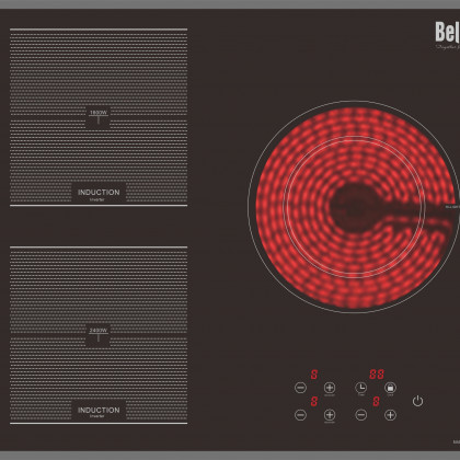 * Bếp hỗn hợp điện từ 03 lò nấu. * Bếp sử dụng công nghệ Inverter thông minh vượt trội, tiết kiệm 35% điện năng tiêu thụ. * Điều khiển bằng cảm ứng điện tử * Công suất cực lớn với tính năng nấu nhanh Booster – max 2400W * Mặt kính schott ceran Đức, vát cạnh thời trang, bo viền 2 cạnh * Bàn phím cảm ứng , 9 mức công suất + Booster * Hẹn giờ độc lập cho từng vùng nấu, thời gian hẹn giờ lên đến 1giờ 59 phút * Chức năng chống tràn.